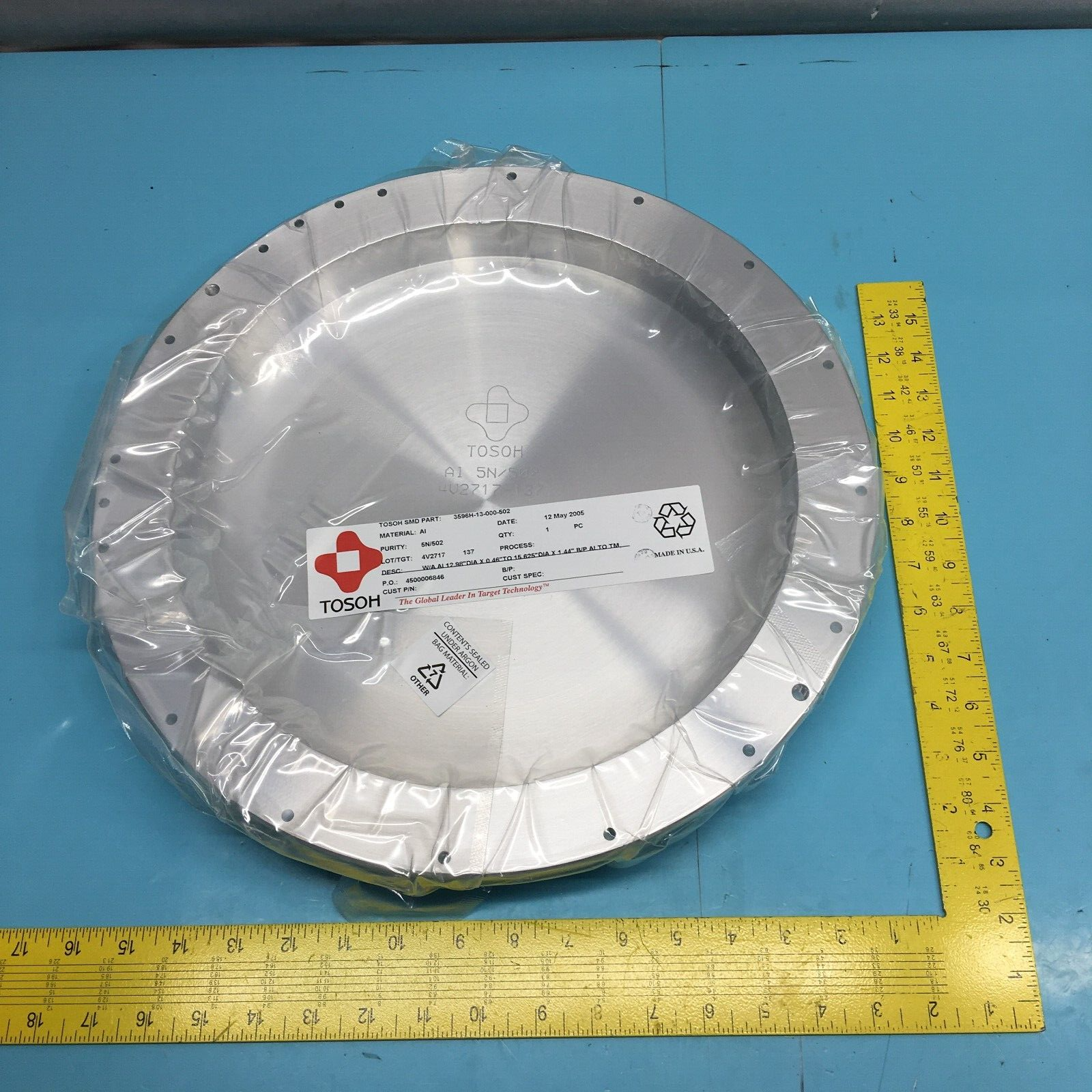 Tosoh 3596H-13-000-502 Target, Al, 5N/502, W/A Al 12.98"DIA X 0.46"TO 15.625"DIA X 1.44" B/P AL TO TM,